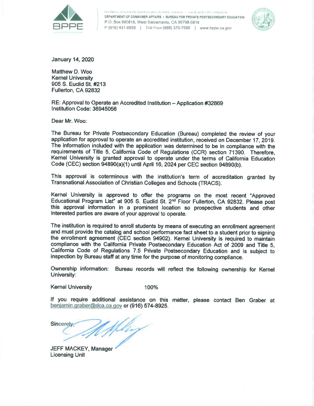 Kernel University is a nonprofit religious institution offering degrees and certificates in theological disciplines and has received exempt status (application no. 27006) from California Bureau for Private Postsecondary Education under California Education Code (CED) section 94874(e)(1).